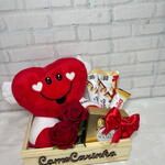 kinder bueno - 2 pcs pelúcia coração - 1 pcs caixa ferrero rocher com 4 - 1 pcs caixa com carinho 25x15 em madeira pinus - 1 pcs nutella chocolate - 1 pcs rosa de veludo - 2 pcs cartão com foto - 1 pcs