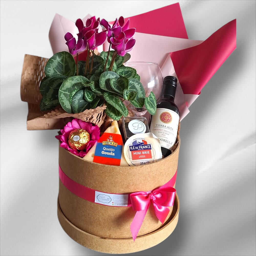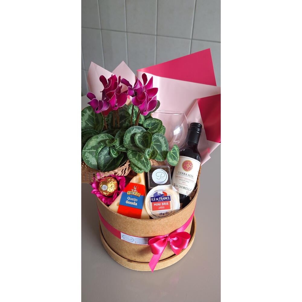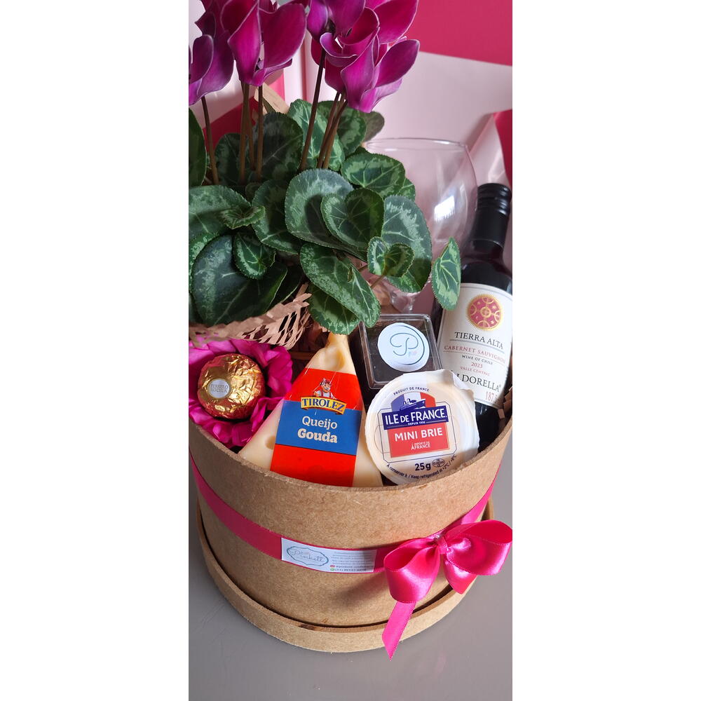 queijo brie ile de france - 1 pcs queijo gouda - 1 pcs caixa de madeira personalizada - 1 pcs um vaso de flor (modelo conforme estoque) - 1 pcs vinho cabernert suavignon mini - 1 pcs geleia artesanal 80gr - 1 pcs ferreiro rocher na forminha de flor - 1 pcs taça de vinho – para brindar - 1 pcs