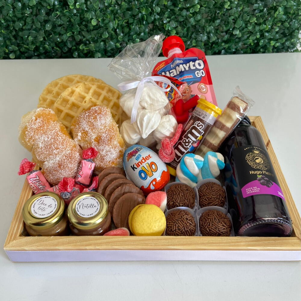 kinder ovo - 1 pcs nutella - 1 pcs iogurte - 1 pcs kinder bueno - 1 pcs m&ms - 1 pcs brigadeiros - 1 pcs marshmallow - 1 pcs waffle - 1 pcs pães doce - 1 pcs doce de leite - 1 pcs balas - 1 pcs balas fini - 1 pcs suco integral - 1 pcs cartão dedicatória - 1 pcs doces - 1 pcs caixa em madeira pinus 30x20 - 1 pcs suspiro - 1 pcs bolachas calipso - 1 pcs