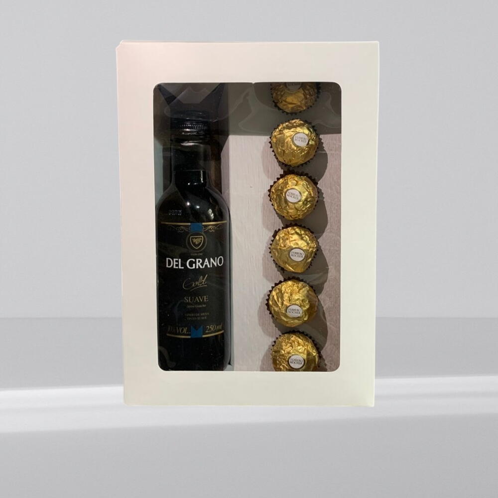 Presenteie alguém especial com este elegante conjunto de presente com bebida. Ele vem com uma encantadora embalagem para presente, seis unidades luxuosas da amada Ferrero Rocher e uma garrafa de 250 ml de vinho suave. Este é o presente perfeito para aniversários, aniversários ou qualquer ocasião especial, mostrar o quanto você se importa nunca foi tão gostoso e elegante.