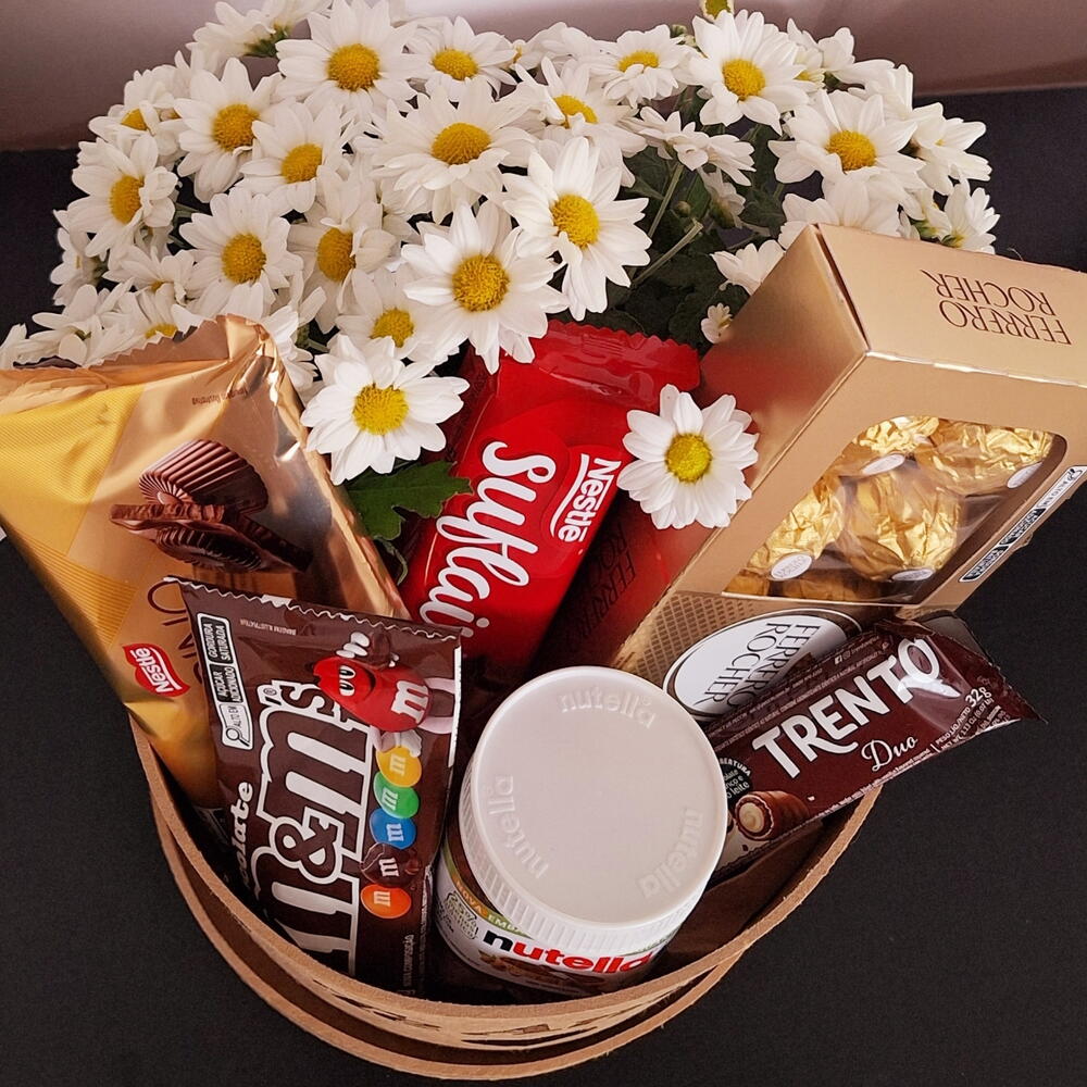 Esta cesta de chocolate é um verdadeiro paraíso para os amantes do chocolate. Inclui uma barra de chocolate Suflair para um toque macio e aveludado, uma unidade de Nutella de 140gr para uma indulgência cremosa e uma dose de alegria na forma de MMs. Não podíamos esquecer o irresistível Chocolate Trento e a nobre Barra de Chocolate Alpino (90g), ambos proporcionando uma experiência única de degustação. A caixa de Ferrero com 8un adiciona um toque elegante a esta cesta. E para complementar, temos também um belo crisântemo, na côr branca ou amarela, junto com uma caixa redonda personalizada em MDF, tornando este presente ainda mais especial. Aproveite cada mordida deste deleite de chocolate.