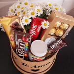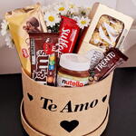 barra de chocolate suflair - 1 pcs nutella 140gr - 1 pcs mms - 1 pcs chocolate trento - 1 pcs barra de chocolate alpino (90g) - 1 pcs caixa ferrero com 8un - 1 pcs caixa box de mdf redonda personalizada - 1 pcs adesivo podendo ser te amo ou feliz dia - 1 pcs flor (cor disponível no momento) - 1 pcs