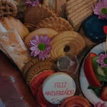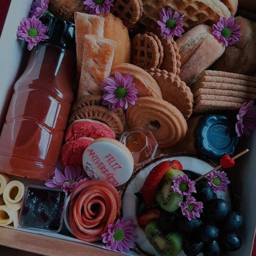 croissant - 1 pcs suco - 500 ml torrada - 6 pcs mel - 50 ml mini geleia - 50 ml waffles - 2 pcs uvas - 75 g biscoito folhado - 2 pcs presunto fatiado - 75 g madeleine - 1 pcs bisnaguinha - 2 pcs drip coffee (café individual) - 1 pcs queijo fatiado - 75 g biscoito de baunilha - 2 pcs biscoito decorado artesanal - 1 pcs biscoito de leite com recheio - 2 pcs biscoito de leite com cobertura de chocolate - 2 pcs banana (ou outra fruta da estação) - 1 pcs sobremesa pudim de leite condensado - 1 pcs