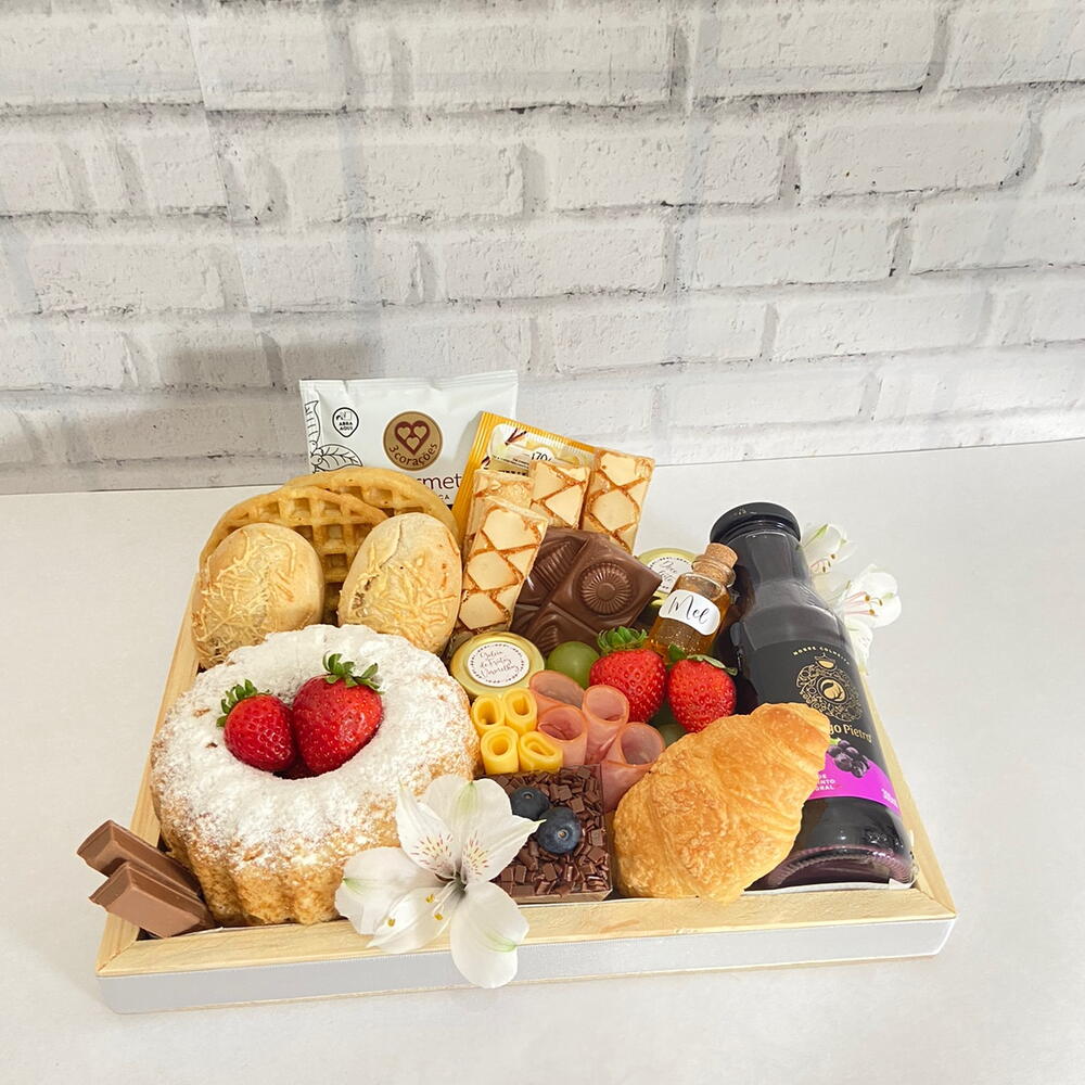 queijo - 1 pcs chocolate - 1 pcs croissant - 1 pcs flor - 1 pcs geleia - 1 pcs chá - 1 pcs mel - 1 pcs café - 1 pcs waffle - 1 pcs damasco - 1 pcs laranja desidratada - 1 pcs biscoitos folhados - 1 pcs suco integral - 1 pcs lombo - 1 pcs caixa em madeira pinus 30x20 - 1 pcs bolo de vó - 1 pcs tipos de frutas da época - 2 pcs pães salgado - 1 pcs sobremesa surpresa - 1 pcs