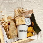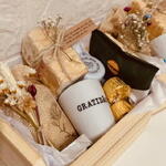 cartão com mensagem - 1 pcs drip coffee - 1 pcs pote de geleia artesanal - 30 g mini torrada - 1 pcs caneca porcelana 330ml - 1 pcs chocolates ferrero rocher flores - 2 pcs saquinho de tecido com biscoito amanteigado - 100 g mini bouquet desidratado - 1 pcs caixote de mdf 20 cm - 1 pcs