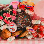 kinder ovo - 1 pcs cookies - 1 pcs pão de queijo - 1 pcs morangos - 1 pcs bolo de chocolate - 1 pcs balas - 1 pcs pirulito - 1 pcs canudo - 1 pcs uvas sem sementes - 1 pcs copo - 1 pcs danoninho - 1 pcs bolinhas de sabão - 1 pcs mini vasinho de flor - 1 pcs balãozinhos - 1 pcs