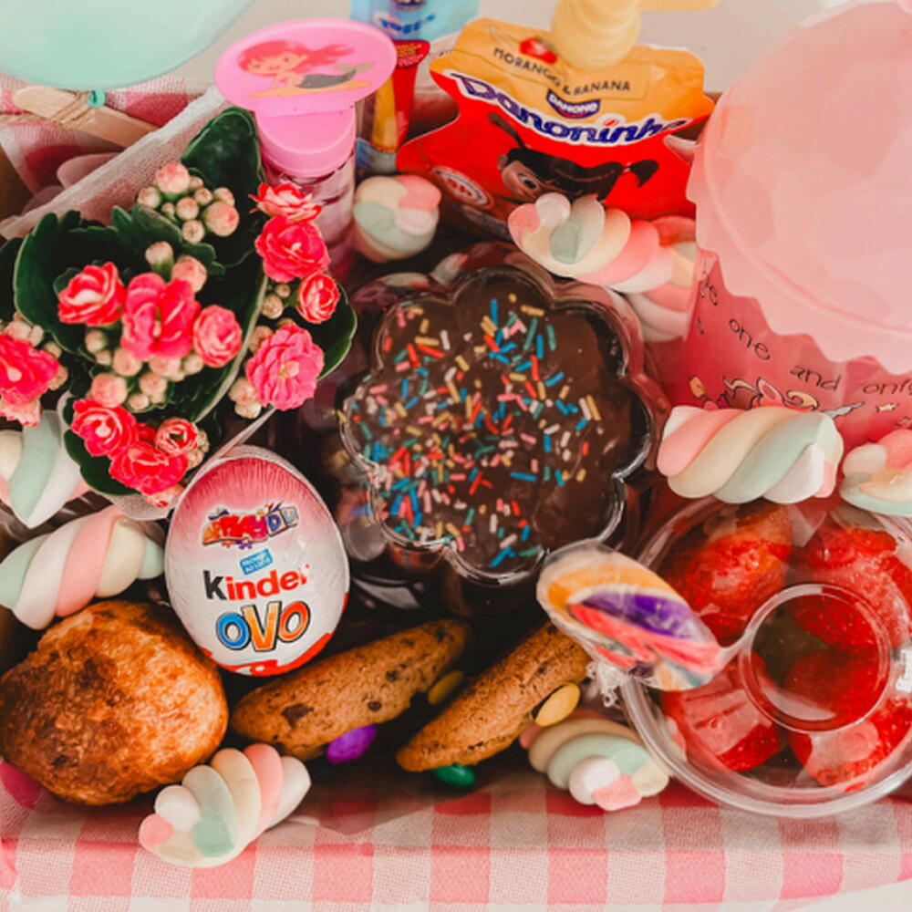 kinder ovo - 1 pcs cookies - 1 pcs pão de queijo - 1 pcs morangos - 1 pcs bolo de chocolate - 1 pcs balas - 1 pcs pirulito - 1 pcs canudo - 1 pcs uvas sem sementes - 1 pcs copo - 1 pcs danoninho - 1 pcs bolinhas de sabão - 1 pcs mini vasinho de flor - 1 pcs balãozinhos - 1 pcs