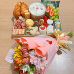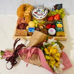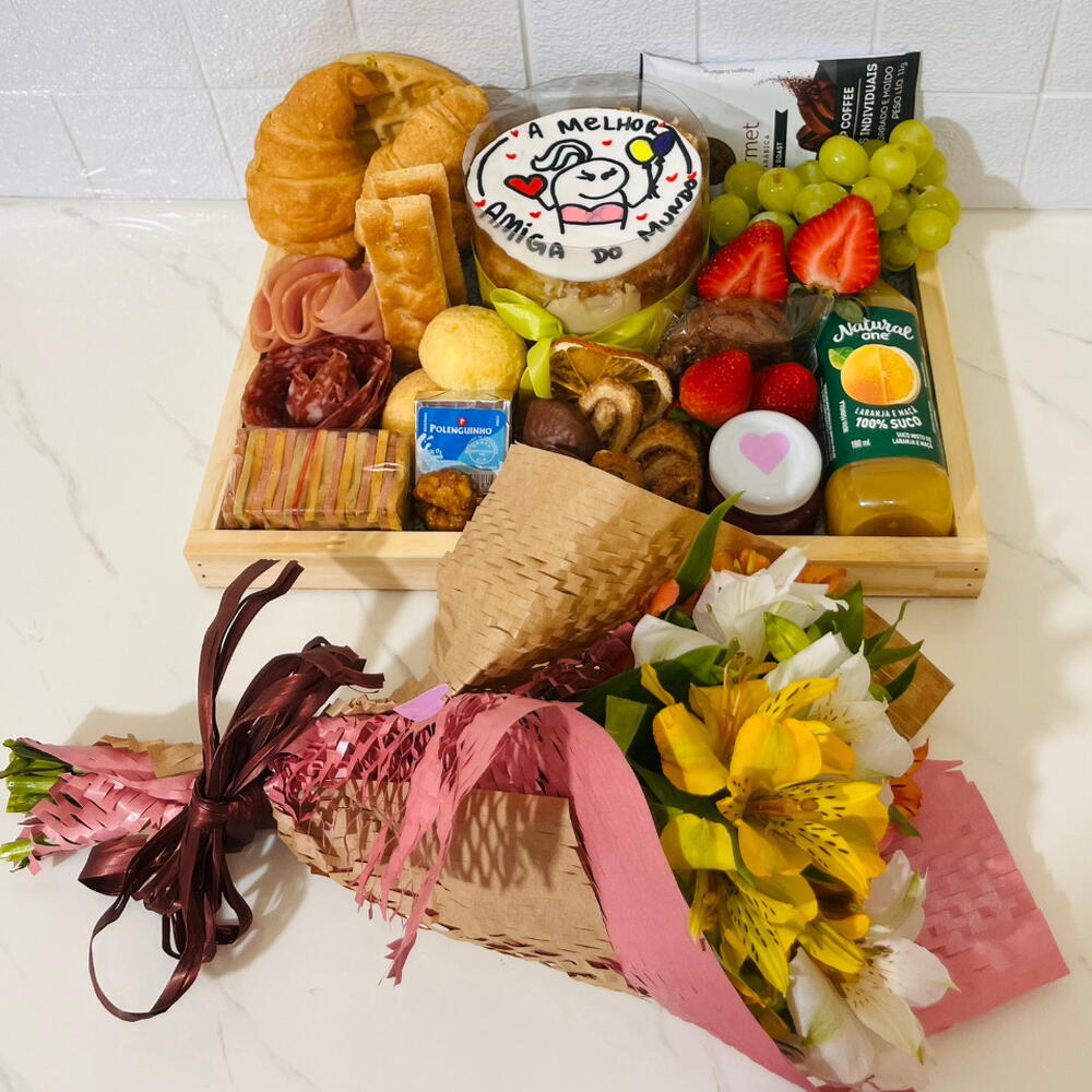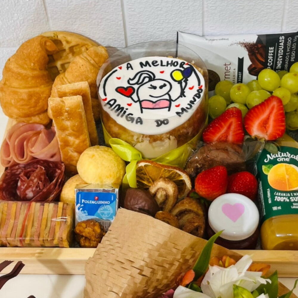 croissant - 1 pcs salame - 1 pcs uva - 1 pcs torrada - 1 pcs pão de queijo - 1 pcs polenguinho - 1 pcs cookie - 1 pcs morango - 1 pcs drip coffe - 1 pcs muffin - 1 pcs wafle - 1 pcs lombo - 1 pcs frescatino - 1 pcs buquê de astromélia box suco - 1 pcs bolachinha folhada - 1 pcs