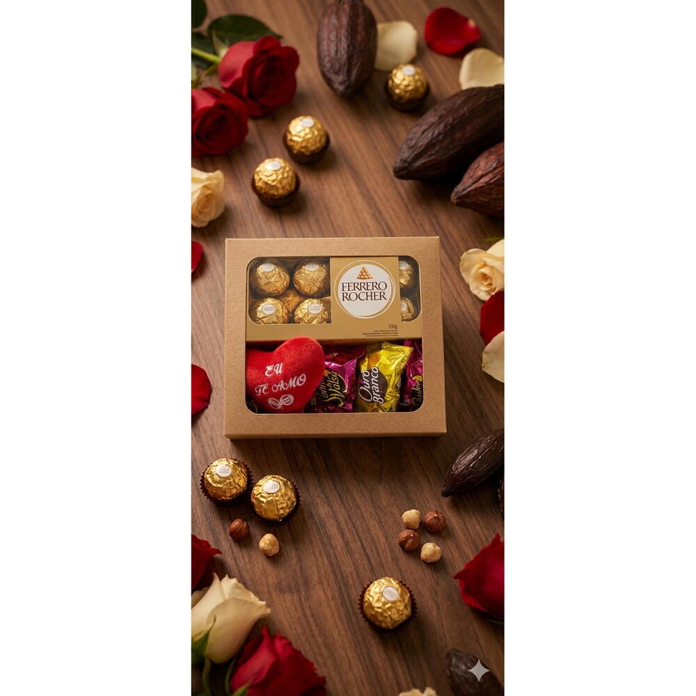 Esta cesta de chocolate deluxe é uma verdadeira tentação! Acompanhada de 2 unidades do apaixonante Sonho de Valsa, 1 unidade do tão adorado Ouro Branco e 1 unidade do elegante e sofisticado Ferrero com 8 unidades. Para tornar este presente ainda mais especial, incluímos também uma adorável pelúcia em formato de coração. Perfeita para presentear quem você ama em qualquer ocasião.