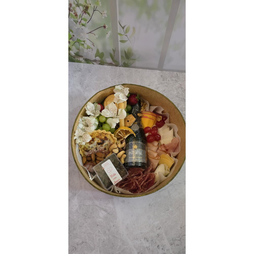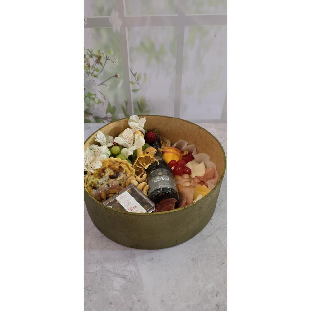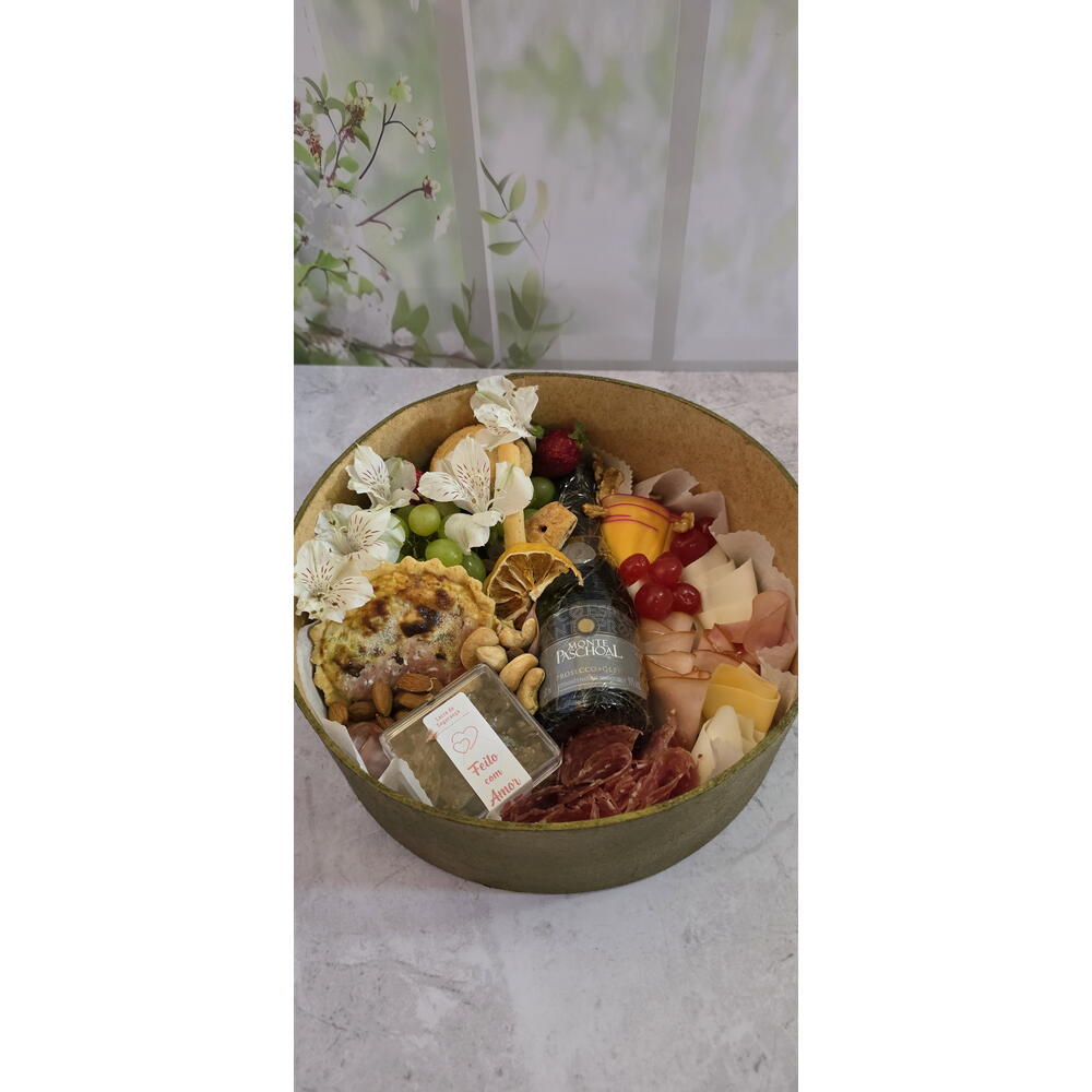 Este kit requintado Presente com Bebida é a escolha perfeita para uma ocasião especial. Nutre o paladar com uma seleção de deliciosos sabores: torradas crocantes, pães frescos e nuts saborosos. Incluí ainda uma caponata de berinjela de dar água na boca, feita com os ingredientes mais frescos. Saboreie um vinho importado de 175 ml, perfeitamente complementado por um doce de creme brulee e um mix de chocolates e trufas indulgentes. Para um toque frutado, o kit inclui uma mistura de frutas frescas e secas. Finalize essa deliciosa refeição com um rico mousse de gorgonzola e dois tipos de fantastícos queijos e charcutaria. O presente perfeito para os gourmands mais refinados!