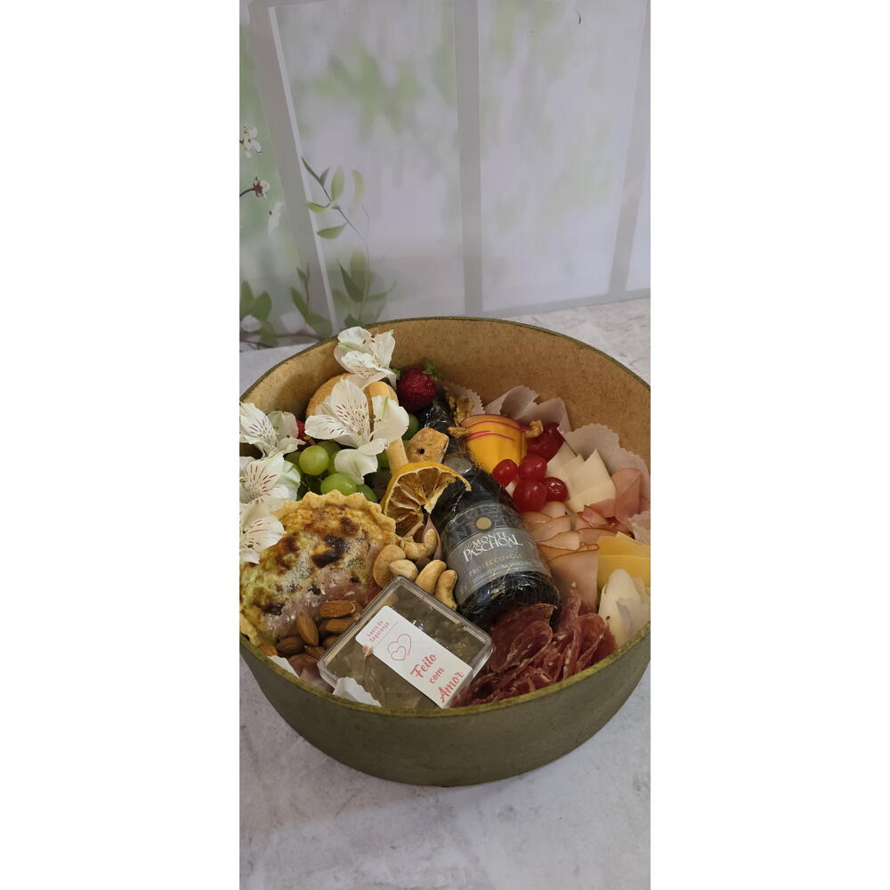 torradas - 1 pcs pães - 1 pcs nuts - 1 pcs caponata de berinjela - 1 pcs vinho de 175 ml importado - 1 pcs madeleine creme brulee - 1 pcs chocolate e trufas - 1 pcs frutas frescas e secas - 1 pcs mousse de gorgonzola - 1 pcs 2 tipos de queijos; - 2 pcs 2 tipos de charcutaria - 2 pcs