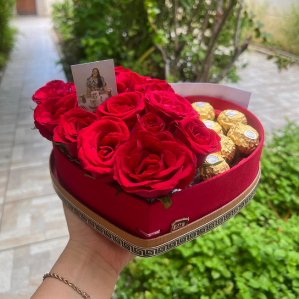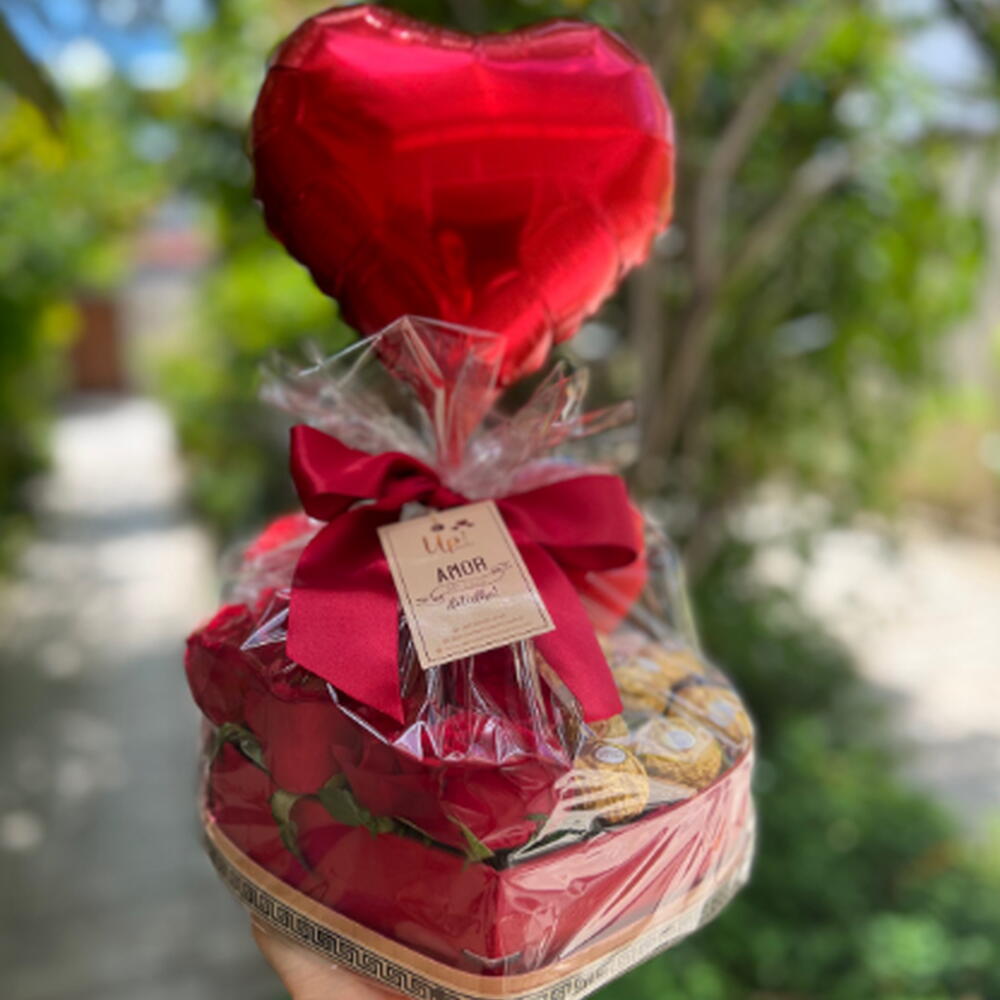 Presenteie alguém especial com esta encantadora Cesta de Chocolate. Composta por 12 rosas frescas e vibrantes a adicionar um toque de elegância. Cumprimenta as delícias de 8 Ferrero Rocher, conhecidas pelo seu sabor inconfundível. Para tornar seu presente mais pessoal, acrescentamos 3 fotos selecionadas por você e uma plaquinha com frases personalizadas. Para completar esta surpresa encantadora, incluímos um balão colorido e alegre. Este presente é a combinação perfeita de beleza e sabor, garantindo trazer um sorriso ao rosto do seu ente querido.