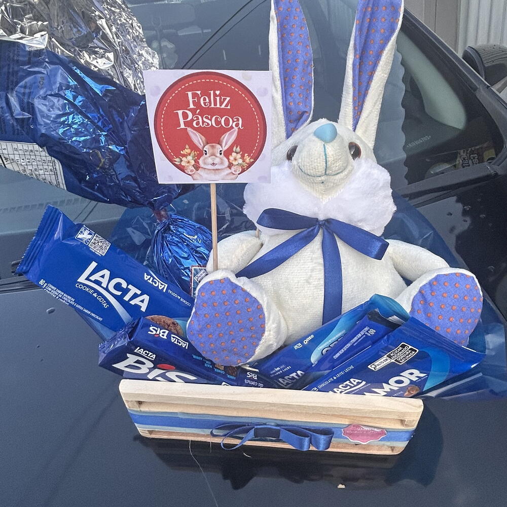 Deleite-se com a nossa cesta de chocolate requintada, embalada com o doce prazer de diversas guloseimas. Composto por 4 barras de chocolate tentadoras, uma caixa de Bis saborosos, e um ovo de Páscoa Lacta para aquela surpresa extra. A cereja do bolo é o nosso gracioso coelhinho e um tag desejo de Feliz Páscoa. Apresentado numa cesta decorada com um laço luxuoso e embalado em celofane para aquele toque final perfeito. É um presente que certamente encantará em qualquer ocasião.