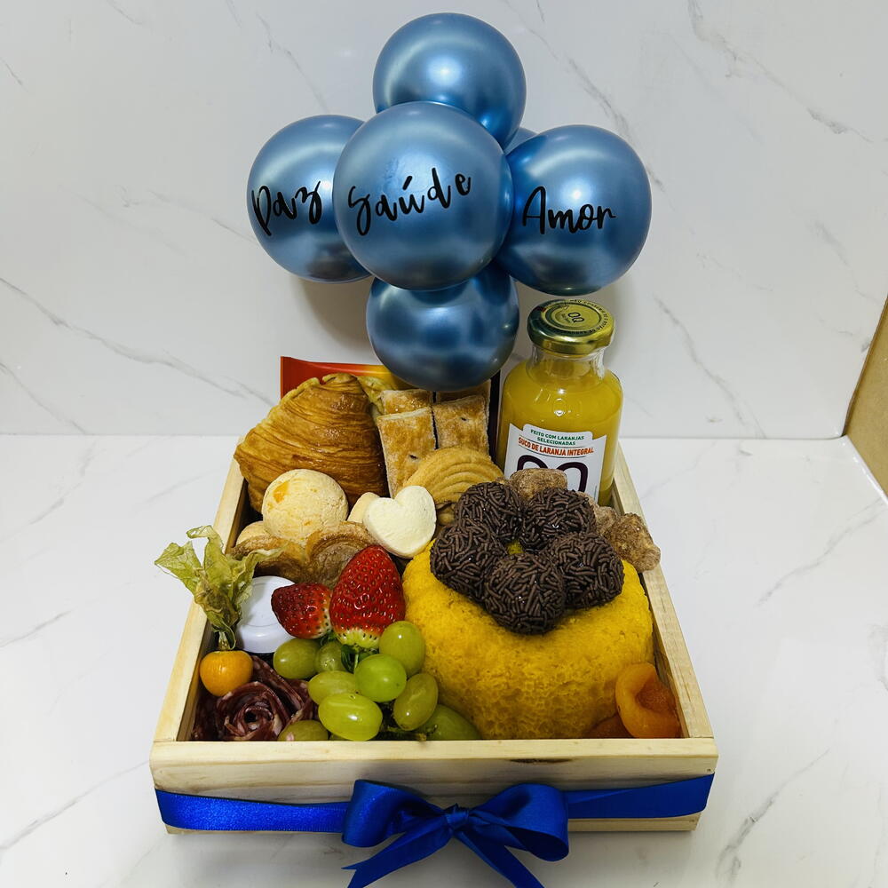 Presenteie alguém especial com a nossa Cesta de Café da Manhã! Esta cesta reúne uma seleção deliciosa e variada de produtos como croissant crocante, suco refrescante, fatia de salame, uvas frescas, geleia saborosa, pão de queijo tradicional, waffle saboroso, morangos frescos e azucrinados, um coração cheio de amor, e não poderia faltar o nosso bolinho azul especial. Para tornar o seu café da manhã ainda mais completo, incluímos um bolo de cenoura com cobertura de brigadeiros, deliciosas bolachinhas recheadas, e um balão nas cores rosa ou dourado para dar um toque de alegria ao iniciar o dia. Surpreenda com essa cesta repleta de sabores e carinho!