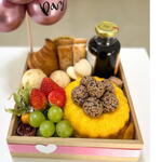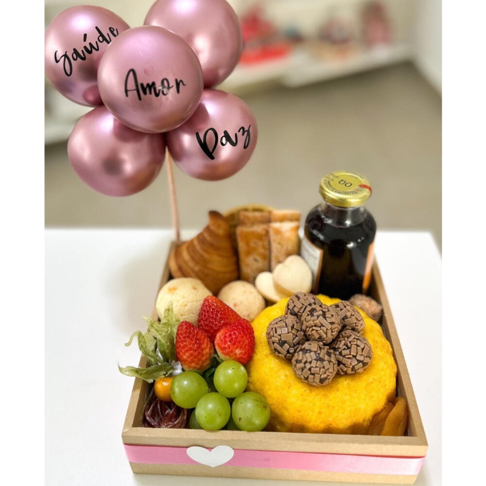 croissant - 1 pcs suco - 1 pcs salame - 1 pcs uva - 1 pcs geleia - 1 pcs pão de queijo - 1 pcs waffle - 1 pcs morango - 1 pcs coração - 1 pcs azul - 1 pcs bolo de cenoura e brigadeiros - 1 pcs bolachinhas recheada - 1 pcs balão nas cores rosa - 1 pcs ou dourado - 1 pcs