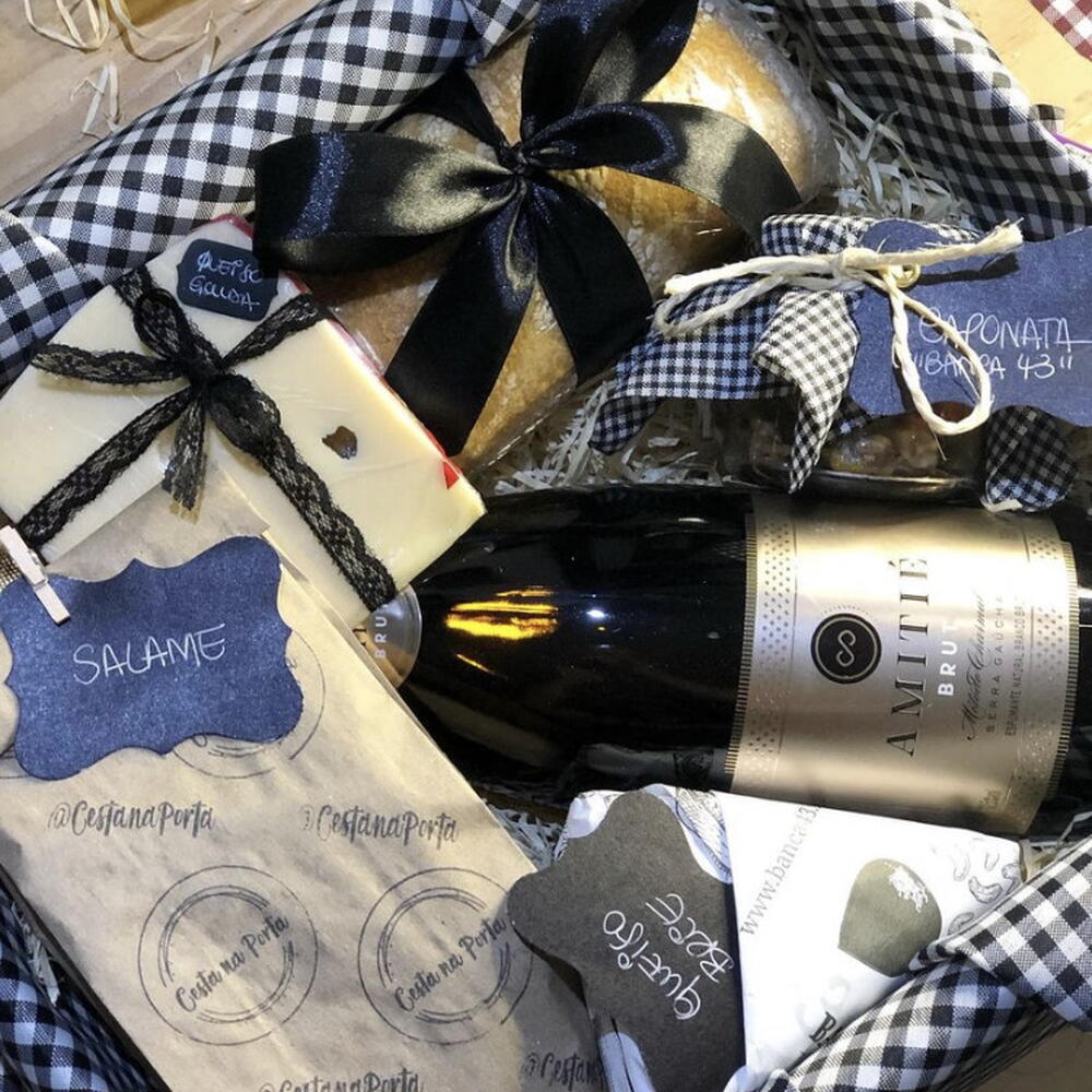 box - 1 pcs salame - 1 pcs caponata - 1 pcs queijo brie - 1 pcs queijo gouda - 1 pcs pão rústico - 1 pcs palha decorativa - 1 pcs laço em cetim - 1 pcs tecido decorativo - 1 pcs caixa (box) - 1 pcs espumante seival miolo - 1 pcs
