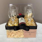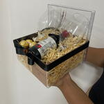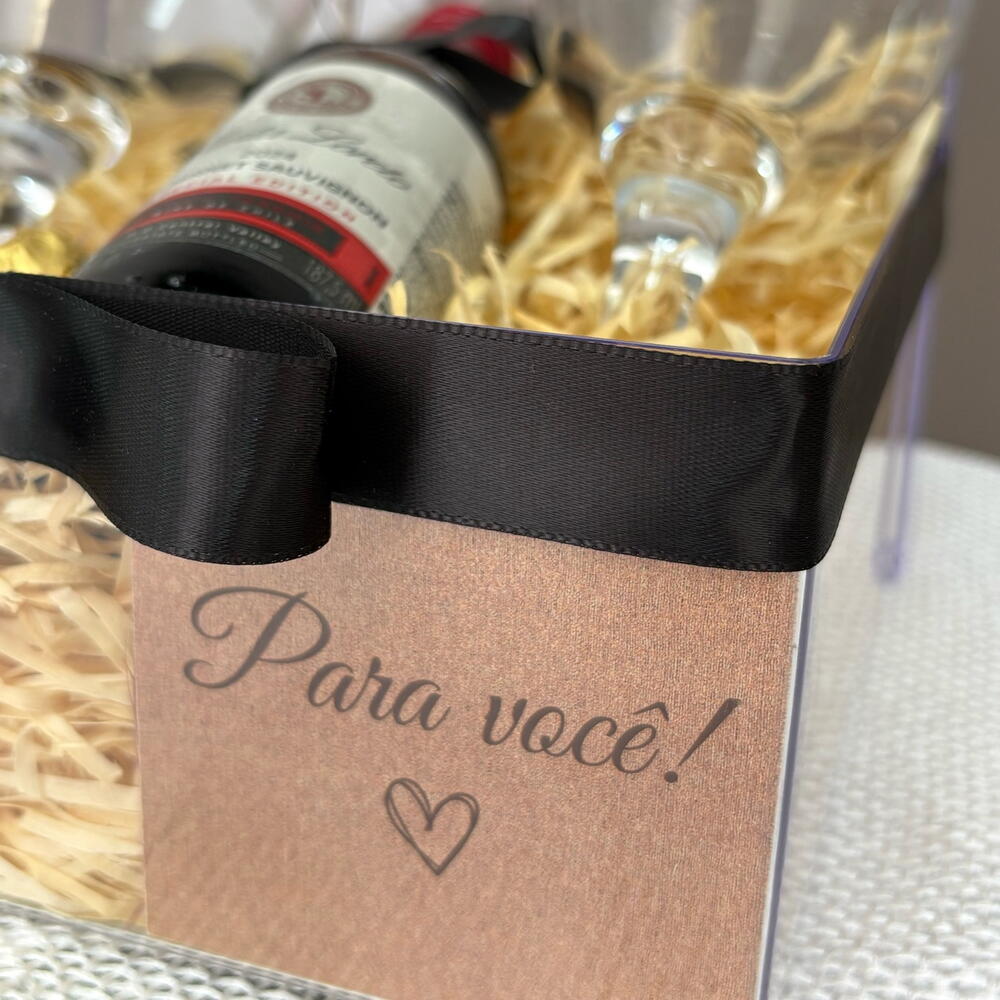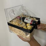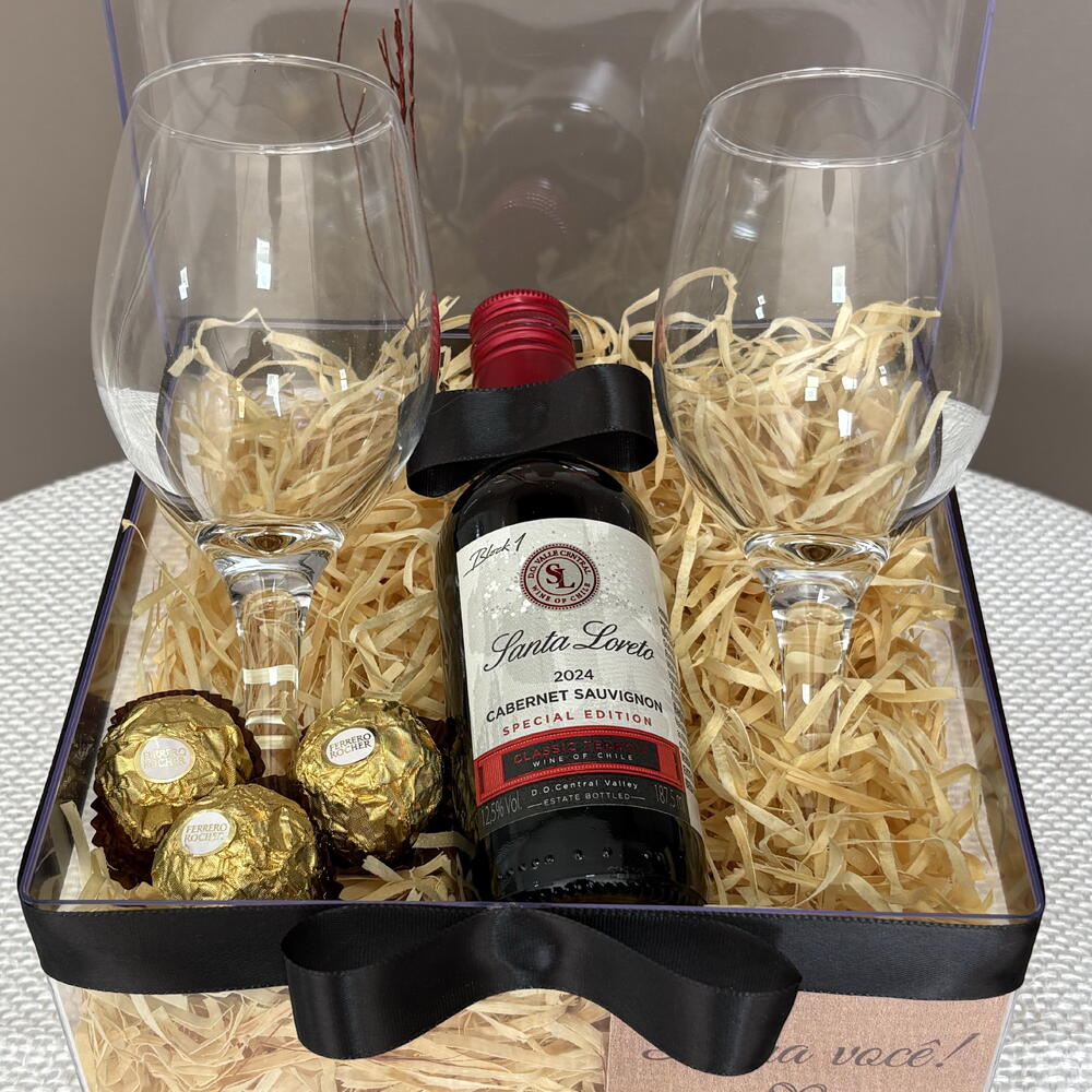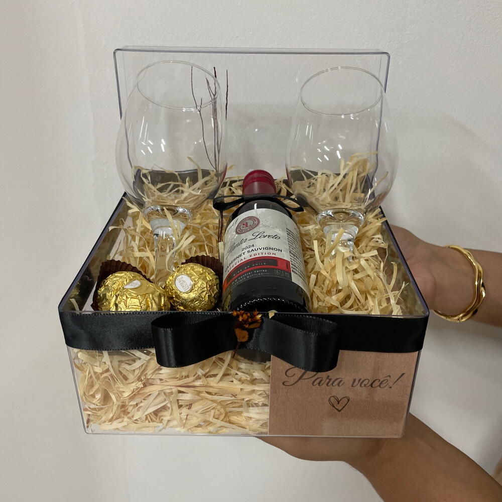 box acrílica decorada - 1 pcs ferrero rocher 3unid - 3 pcs vinho santa loreto 187ml - 1 pcs taças para vinho - 2 pcs