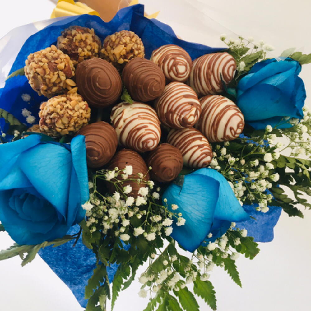 embalagem - 1 pcs folhagens - 1 pcs laço - 1 pcs morangos - 15 pcs rosa azuis - 3 pcs mosquitinhos - 1 pcs