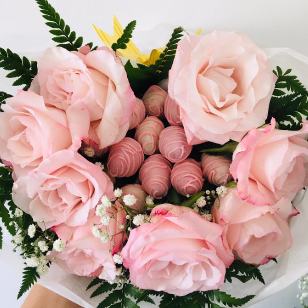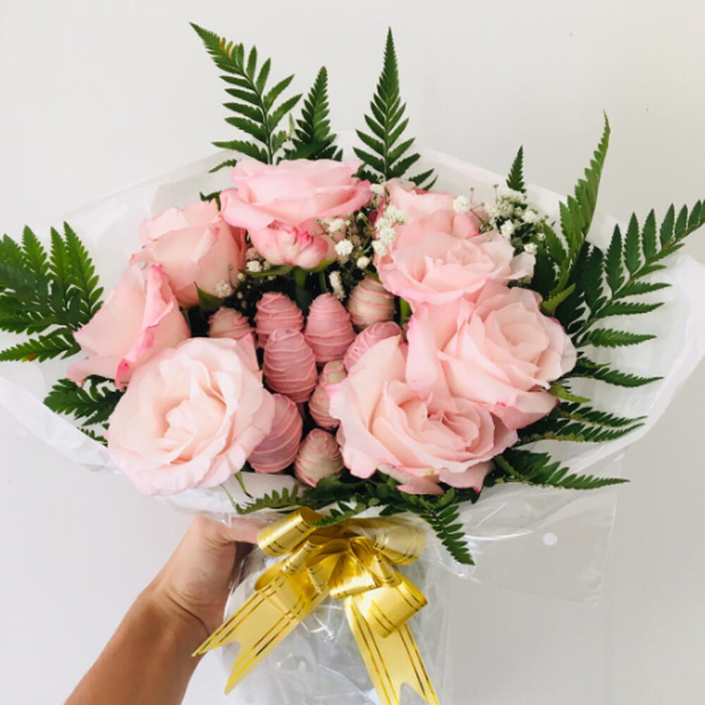 rosa - 6 pcs folhagens - 1 pcs laço - 1 pcs morangos - 12 pcs embalagem moderna - 1 pcs