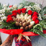 embalagem - 1 pcs folhagens - 1 pcs laço - 1 pcs rosa vermelhas - 10 pcs mosquitinhos - 1 pcs morangos com chocolates - 24 pcs