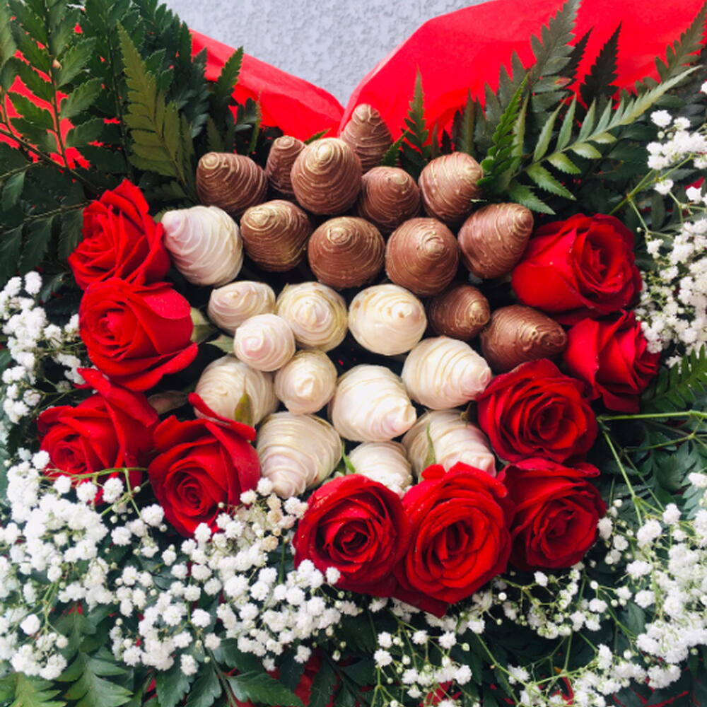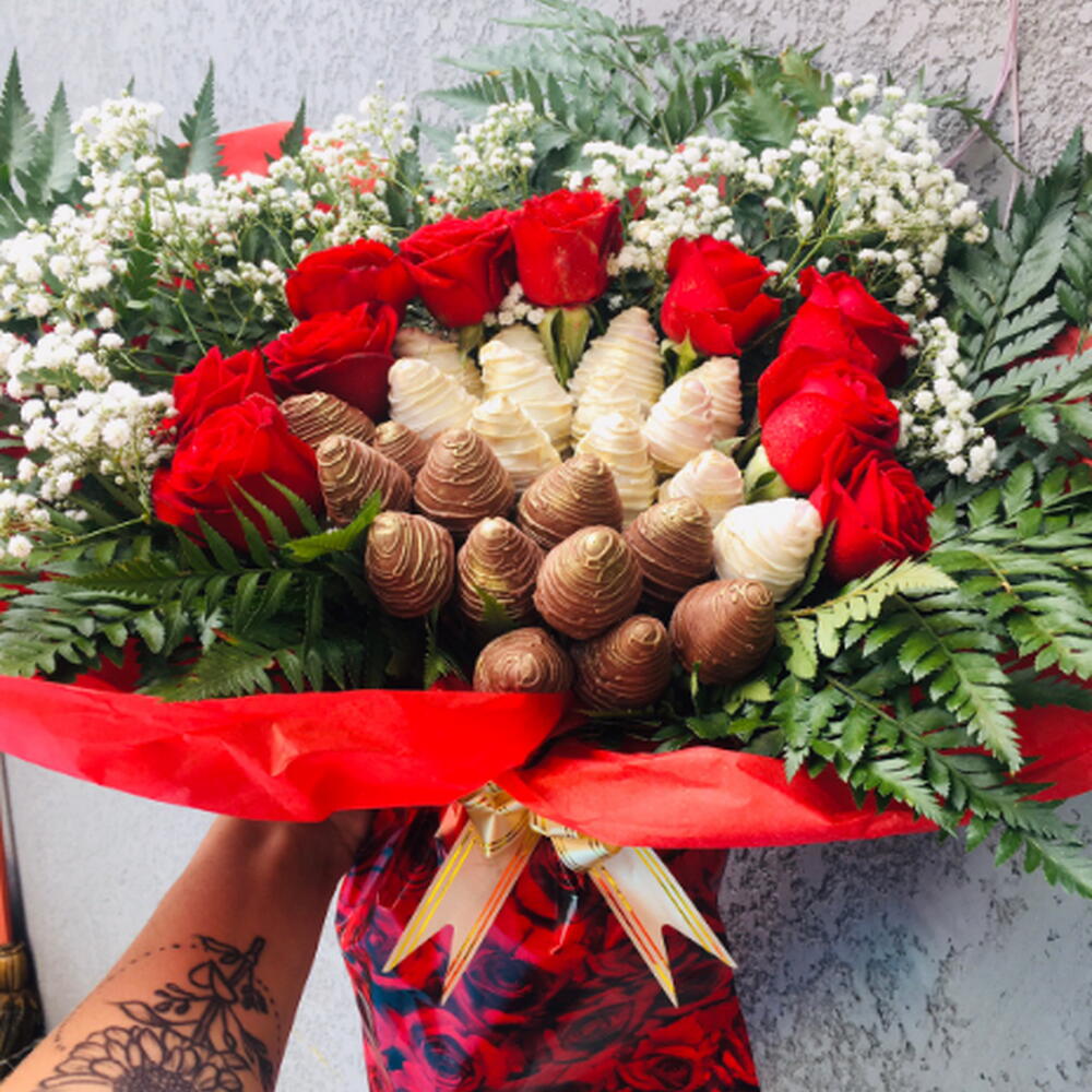 embalagem - 1 pcs folhagens - 1 pcs laço - 1 pcs rosa vermelhas - 10 pcs mosquitinhos - 1 pcs morangos com chocolates - 24 pcs
