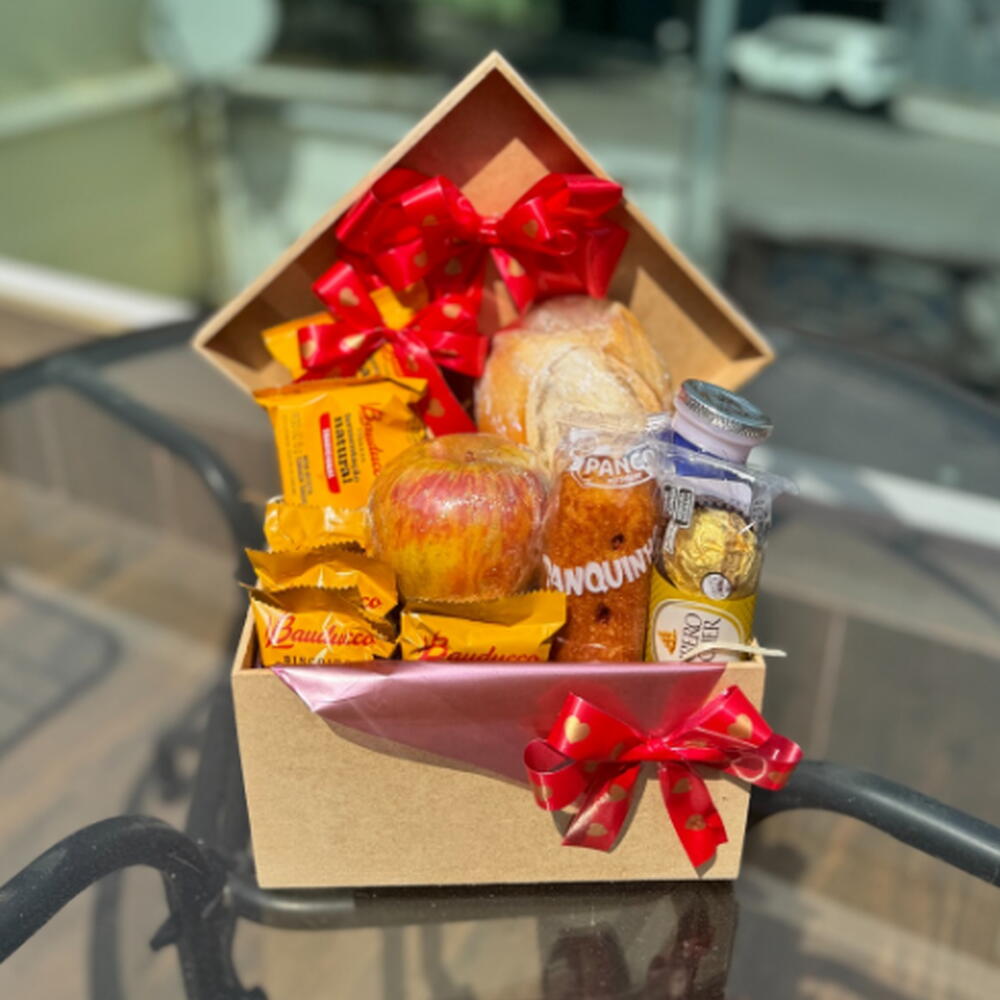 fruta - 1 pcs nutella - 1 pcs ferrero rocher - 3 pcs suco - 1 pcs bolinho - 1 pcs torrada - 1 pcs achocolatado - 1 pcs biscoitos - 3 pcs mini geléia - 1 pcs danone - 1 pcs caixinha decorada de mdf - 1 pcs pão francês ou de forma - 1 pcs
