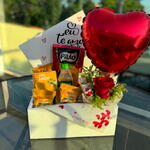 rosa - 1 pcs torradas - 2 pcs suco - 1 pcs café solúvel - 1 pcs bolinho - 1 pcs chá - 1 pcs biscoitos - 6 pcs balão de coração p - 1 pcs
