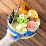 Bandeja redonda 20cm Suco de laranja na garrafa de vidro 300ml Pão fofinho recheado de frios moído Waffle americana Potinho com doce de leite artesanal Croissant amanteigado Macaron rosa típico francês Rosa de lombo canandense Queijo mussarela em formato de coração Uvas Drip coffee Santa Mônica A cesta já vai embalada pronta para presentear com laço, tag, saco celofane e cartão escrito a mão
