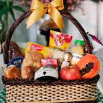 ferrero rocher - 3 pcs cesta - 1 pcs laço - 1 pcs iogurte grego - 1 pcs baguete recheada - 1 pcs tipos de frutas da época - 2 pcs croissant chocolate - 2 pcs pães recheados - 2 pcs sache café solúvel - 1 pcs pct torradas 142 grs - 1 pcs geleia vidro - 1 pcs suco ( uva ou laranja) - 1 pcs leite 200 ml - 1 pcs bolo 200 grs - 1 pcs