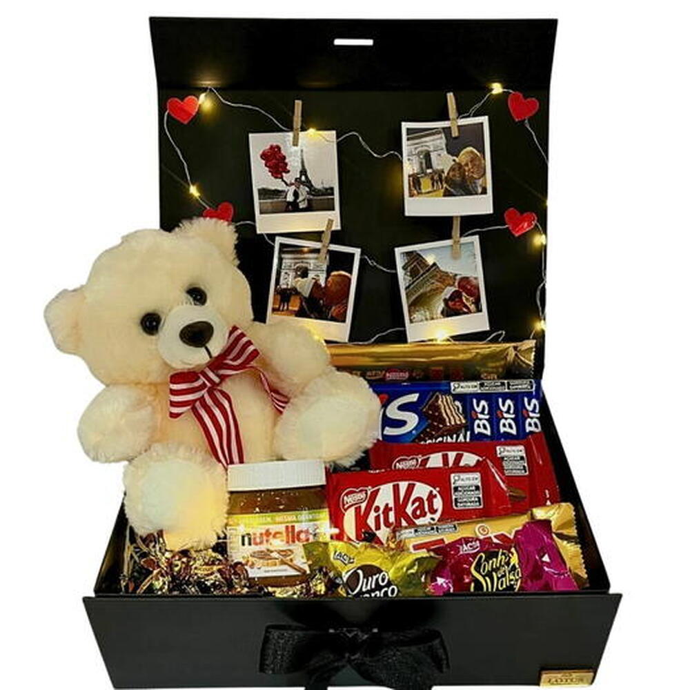 Se o amor de vocês fosse um filme, essa caixa seria aquela cena inesquecível, a que faz todo espectador suspirar. Com chocolates irresistíveis, um urso de pelúcia fofinho e lembranças especiais, ela transforma qualquer momento em um verdadeiro romance digno de Hollywood. Agora, é só escolher o filme e aproveitar esse momento especial! O que inclui? 1 caixa preta decorada. 4 fotos polaroid personalizadas. Fio de LED para criar um clima especial. 1 urso de pelúcia. 10 balas Butter Toffee. 1 pote de Nutella. 2 Kit Kat. 1 Sonho de Valsa. 1 Ouro Branco. 1 Twix. 1 Bis. 1 barra Alpino. Embalagem especial: Tudo cuidadosamente montado para impressionar desde o primeiro olhar. Acenda as luzes, aperte o play e viva essa experiência única a dois. Porque todo casal merece seu próprio final feliz! - Peça já o seu