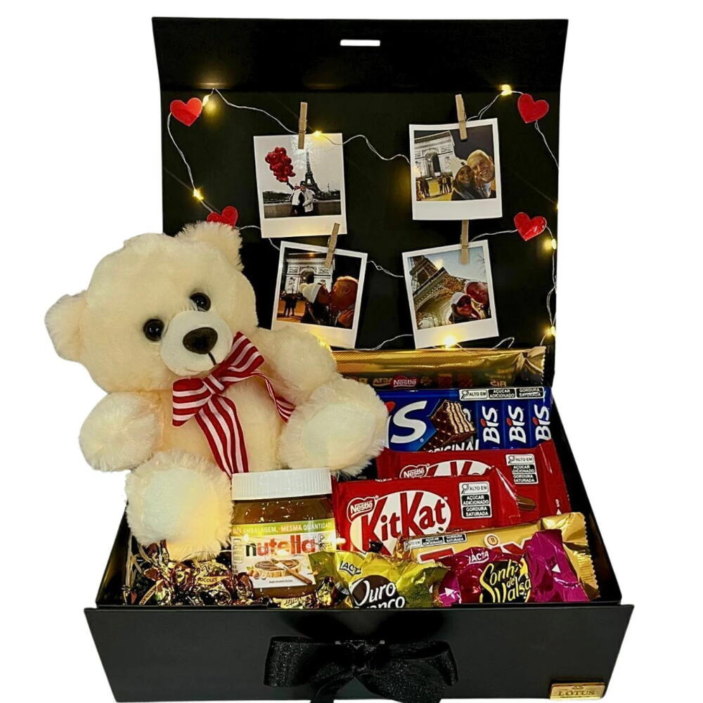 Se o amor de vocês fosse um filme, essa caixa seria aquela cena inesquecível, a que faz todo espectador suspirar. Com chocolates irresistíveis, um urso de pelúcia fofinho e lembranças especiais, ela transforma qualquer momento em um verdadeiro romance digno de Hollywood. Agora, é só escolher o filme e aproveitar esse momento especial! O que inclui? 1 caixa preta decorada. 4 fotos polaroid personalizadas. Fio de LED para criar um clima especial. 1 urso de pelúcia. 10 balas Butter Toffee. 1 pote de Nutella. 2 Kit Kat. 1 Sonho de Valsa. 1 Ouro Branco. 1 Twix. 1 Bis. 1 barra Alpino. Embalagem especial Tudo cuidadosamente montado para impressionar desde o primeiro olhar. Acenda as luzes, aperte o play e viva essa experiência única a dois. Porque todo casal merece seu próprio final feliz! - Peça já o seu