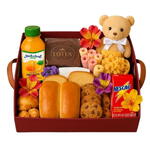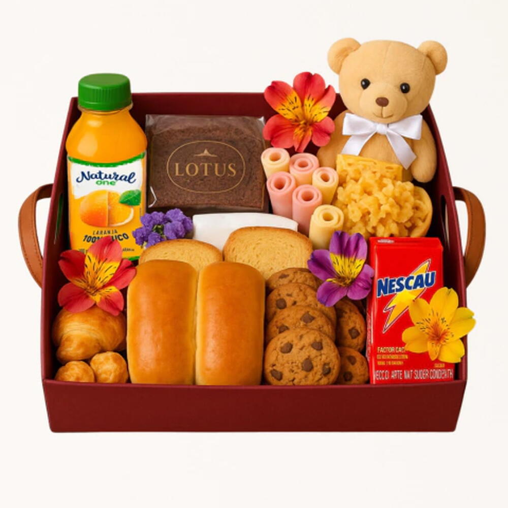 pelúcia - 1 pcs torrada bauducco - 1 pcs cesta - 1 pcs bolo - 1 pcs pão de queijo - 1 pcs waffle - 1 pcs pães de leite - 2 pcs nescau - 1 pcs frios (presunto e queijo) - 1 pcs suco natural one - 1 pcs sachê de manteiga - 1 pcs pacote cookies - 1 pcs margaridinhas coloridas - 2 pcs pacote fini tubes - 1 pcs