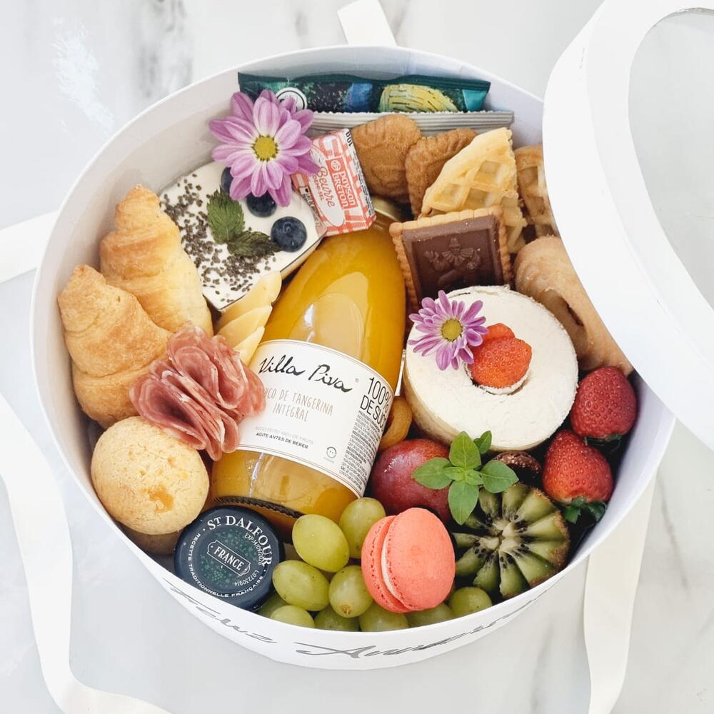 Deleite-se com a nossa Cesta de Café da Manhã. Em uma elegante caixa cartonada com visor, você vai encontrar uma seleção de deliciosos alimentos para dar início ao seu dia. A cesta inclui um suco integral refrescante, uma opção entre Drip coffee ou capuccino para energizar a sua manhã, um mini bolo recheado para adoçar seu paladar, além de um irresistível pão de queijo. Também há um waffle saboroso, um croissant macio, um iogurte cremoso, frios bem selecionados, frutas frescas como kiwi, uva e morango para uma dose saudável de vitaminas. Complementando esta deliciosa seleção há uma porção de manteiga, biscoito amanteigado e folhado que vão fazer das suas manhãs um momento ainda mais especial.