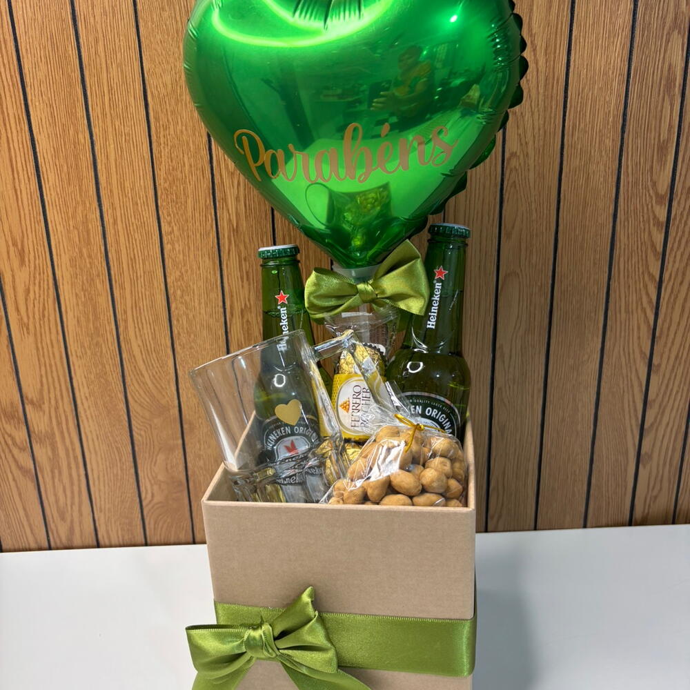 bombons ferrero rocher - 4 pcs balão personalizado - 1 pcs amendoim - 1 pcs cerveja heineken - 2 pcs caixa mdf - 1 pcs caneca chop - 1 pcs