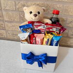 Surpreenda com este presente cheio de carinho e sabor! 💙 Caixa elegante com ursinho de pelúcia, recheada com chocolates variados e bebida, finalizada com um lindo laço. Uma opção perfeita para presentear e encantar em qualquer ocasião! 🎁