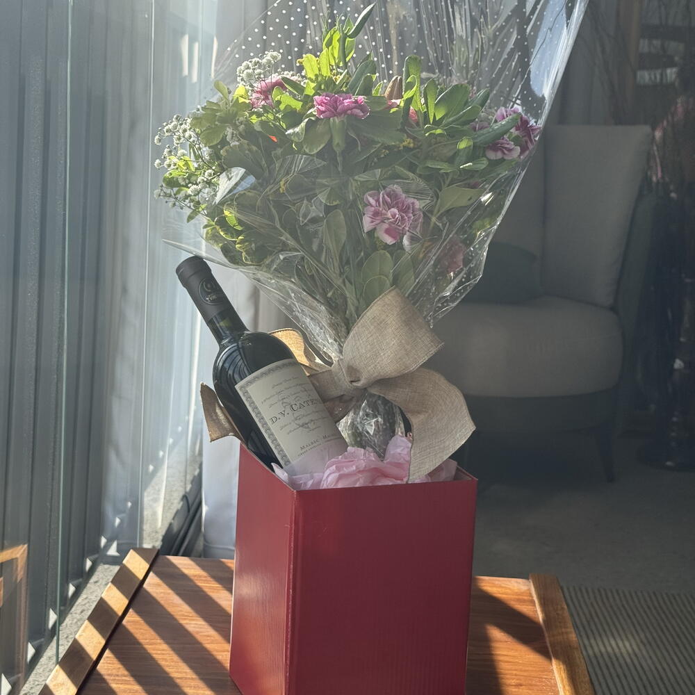 Este encantador presente abrange uma combinação perfeita de beleza e sabor. O produto inclui um buquê de flores naturais cuidadosamente selecionadas, com ramos e folhagens bem arranjados, destacando a sua elegância e frescura. Além disso, a oferta é complementada por uma elegante caixa de presente contendo uma garrafa de vinho de qualidade incrível (sujeito a disponibilidade). Para completar, o presente também vem com uma embalagem atraente que garante a sua apresentação perfeita e um laço delicado que dá um toque final à composição. Uma excelente opção para surpreender alguém com bom gosto!