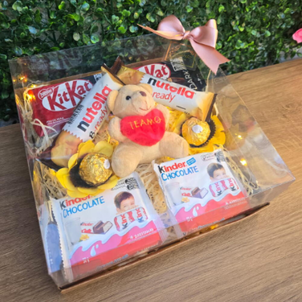 Presenteie alguém especial com esta adorável Cesta de Chocolate! A cesta inclui um irresistível urso de pelúcia e uma variedade de deliciosos chocolates que despertam o paladar. Contém 2 unidades de Ferrero Rocher, 2 unidades de KitKat, e 2 unidades de Kinder Chocolate. Para adicionar um toque especial, a cesta também traz 2 unidades do adorado Nutella Bready. Uma maneira doce e afetuosa de transmitir seu carinho!