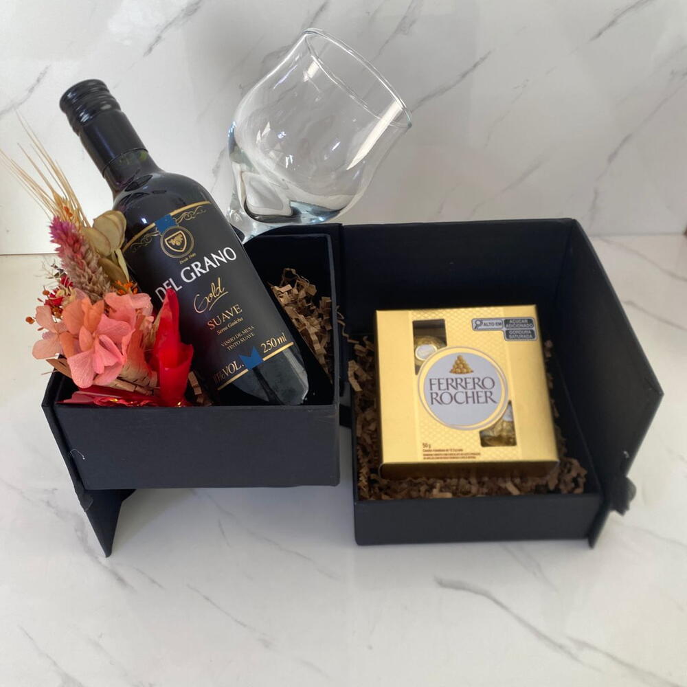 Surpreenda alguém especial com este presente elegante e sofisticado. Composto por 4 deliciosos chocolates Ferrero Rocher, um mini vinho especialmente selecionado para elevar os momentos especiais, flores secas que trazem um toque de beleza natural e delicada, apresentados em uma caixa cartonada premium. Acompanha também uma taça de vidro especial para brindar aos bons momentos. Ideal para presentear em aniversários, celebrações ou simplesmente para mostrar o seu carinho.