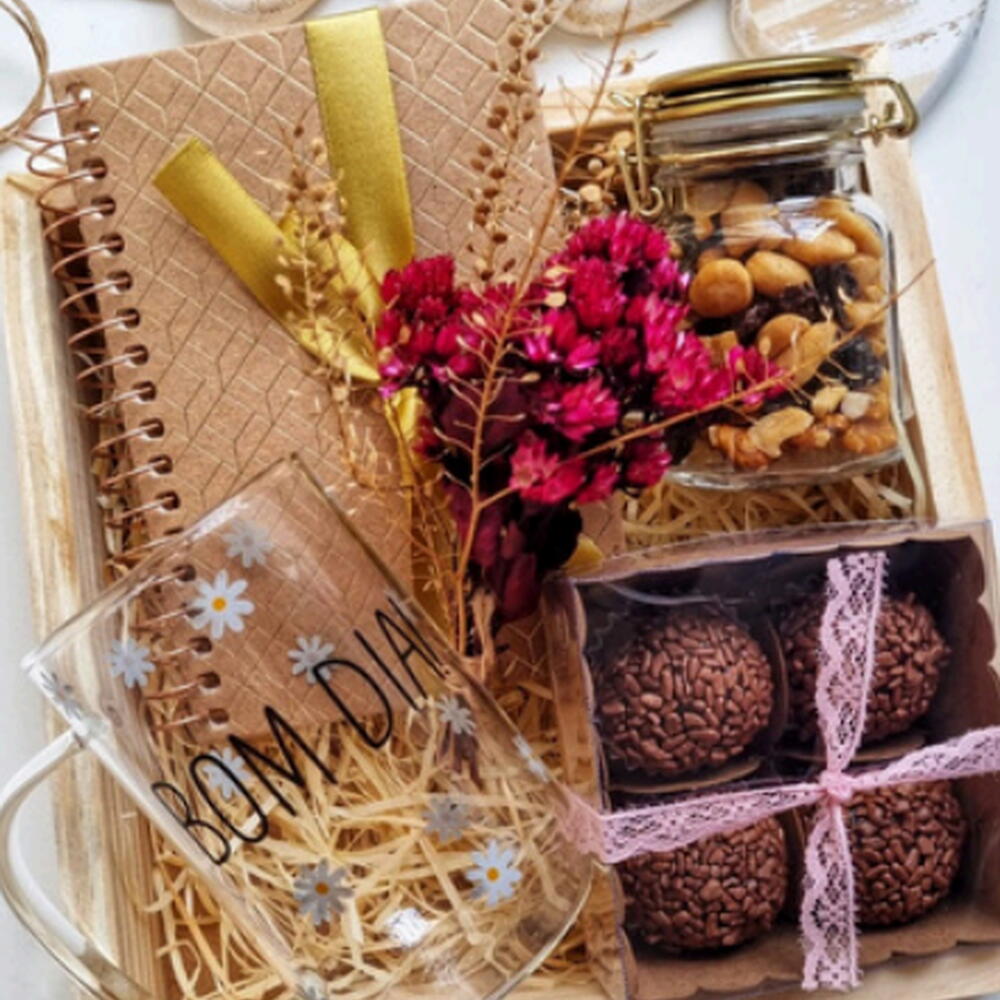 embalagem - 1 pcs cartão - 1 pcs xícara - 1 pcs caixinha pinus 20x20cm - 1 pcs drip coffee ou chá - 1 pcs caderneta para anotações - 1 pcs caixinha com brigadeiro gourmet - 1 pcs potinho de vidro de nuts - 1 pcs bouquet de flores desidratadas - 1 pcs