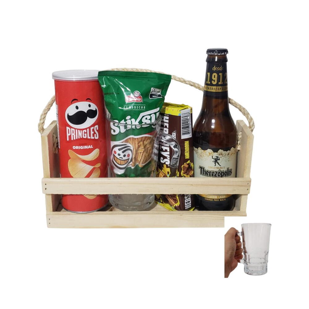 batata pringles - 104 g caneca de vidro - 320 ml caixote em madeira com alças de corda - 1 pcs pacote de waffer hersheys ao leite - 1 pcs caneca de cerveja - 1 pcs cerveja long neck therezópolis - 355 ml salgadinho palito stiksy - 1 pcs