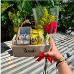 embalagem - 1 pcs laço em cetim - 1 pcs chocolates recheados: sonho de valsa ou ouro branco - 4 pcs cartinha personalizada com sua mensagem especial - 1 pcs 6 docinhos irresistíveis: 2 brigadeiros - 1 pcs 2 beijinhos e 2 bem-casados - 1 pcs rosa vermelha fresca - 1 pcs símbolo de amor e paixão - 1 pcs o caixote doçura medindo 10x20x10 cm - 1 pcs personalizado com o nome do presenteado gravado a laser - 1 pcs
