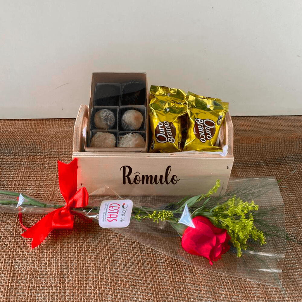embalagem - 1 pcs laço em cetim - 1 pcs chocolates recheados: sonho de valsa ou ouro branco - 4 pcs cartinha personalizada com sua mensagem especial - 1 pcs 6 docinhos irresistíveis: 2 brigadeiros - 1 pcs 2 beijinhos e 2 bem-casados - 1 pcs rosa vermelha fresca - 1 pcs símbolo de amor e paixão - 1 pcs o caixote doçura medindo 10x20x10 cm - 1 pcs personalizado com o nome do presenteado gravado a laser - 1 pcs