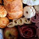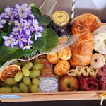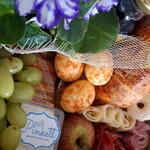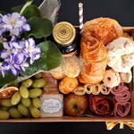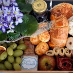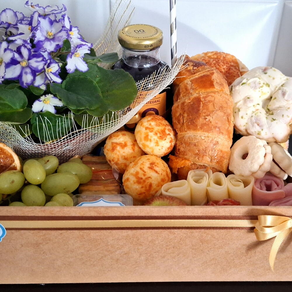 presunto - 100 g laranja desidratada - 1 pcs mussarela - 100 g rosca doce - 1 pcs brioche salgado - 2 pcs croassant recheado - 1 pcs maçã fresca - 1 pcs suco integral (uva ou laranja) - 1 pcs canudo de papel - 1 pcs salame em formato de rosa - 100 g porção de uva sem caroço - 1 pcs pote de acrilico de requeijão - 80 g pacote de mini torradas de ervas - 1 pcs pão de queijo com raspas de parmesão - 4 pcs sequinhos com goiabada - 3 pcs caixa de mdf decorada com fita - 1 pcs flor no vasinho (modelo e cor disponível no momento) - 1 pcs