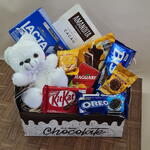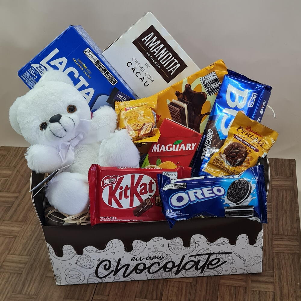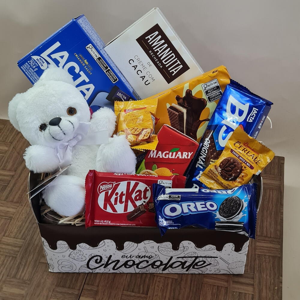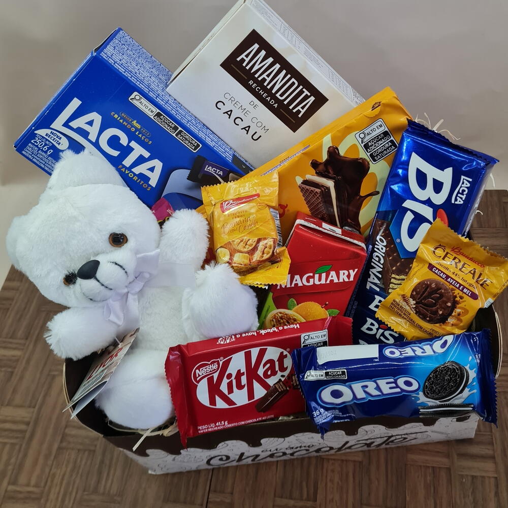 bis - 1 pcs chocolate - 6 pcs kitkat - 1 pcs amanditas - 1 pcs suco 200 ml - 1 pcs bolacha doce - 1 pcs caixa de bombons 250 gr - 1 pcs saches doces - 2 pcs óleo - 1 pcs pelúcia 16 cm - 1 pcs