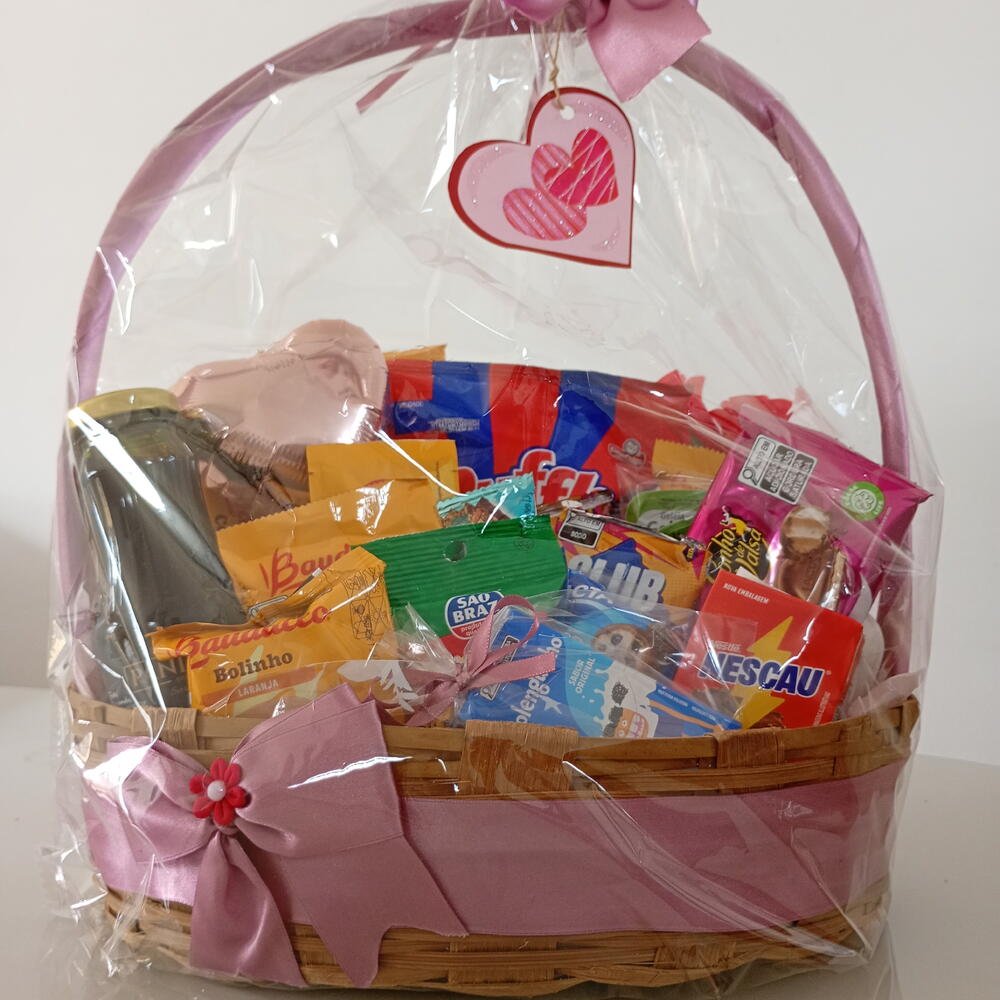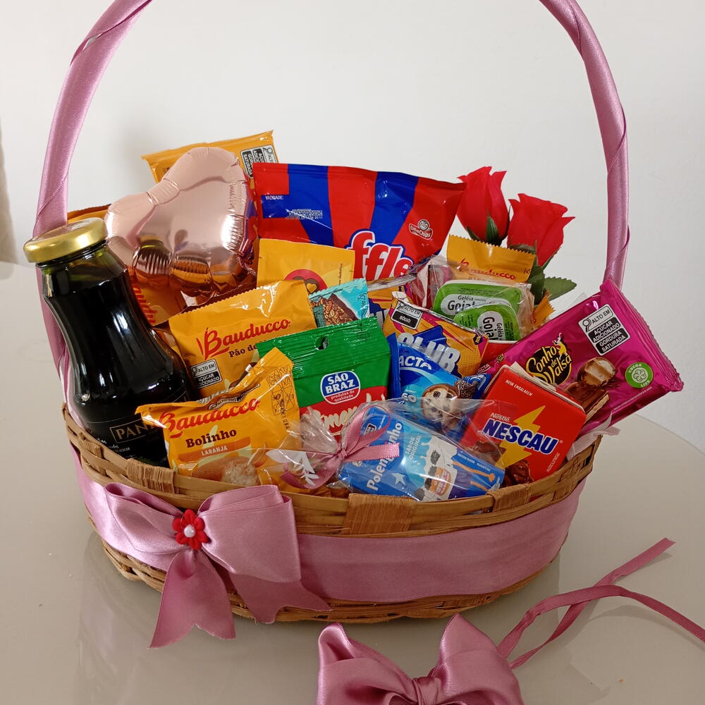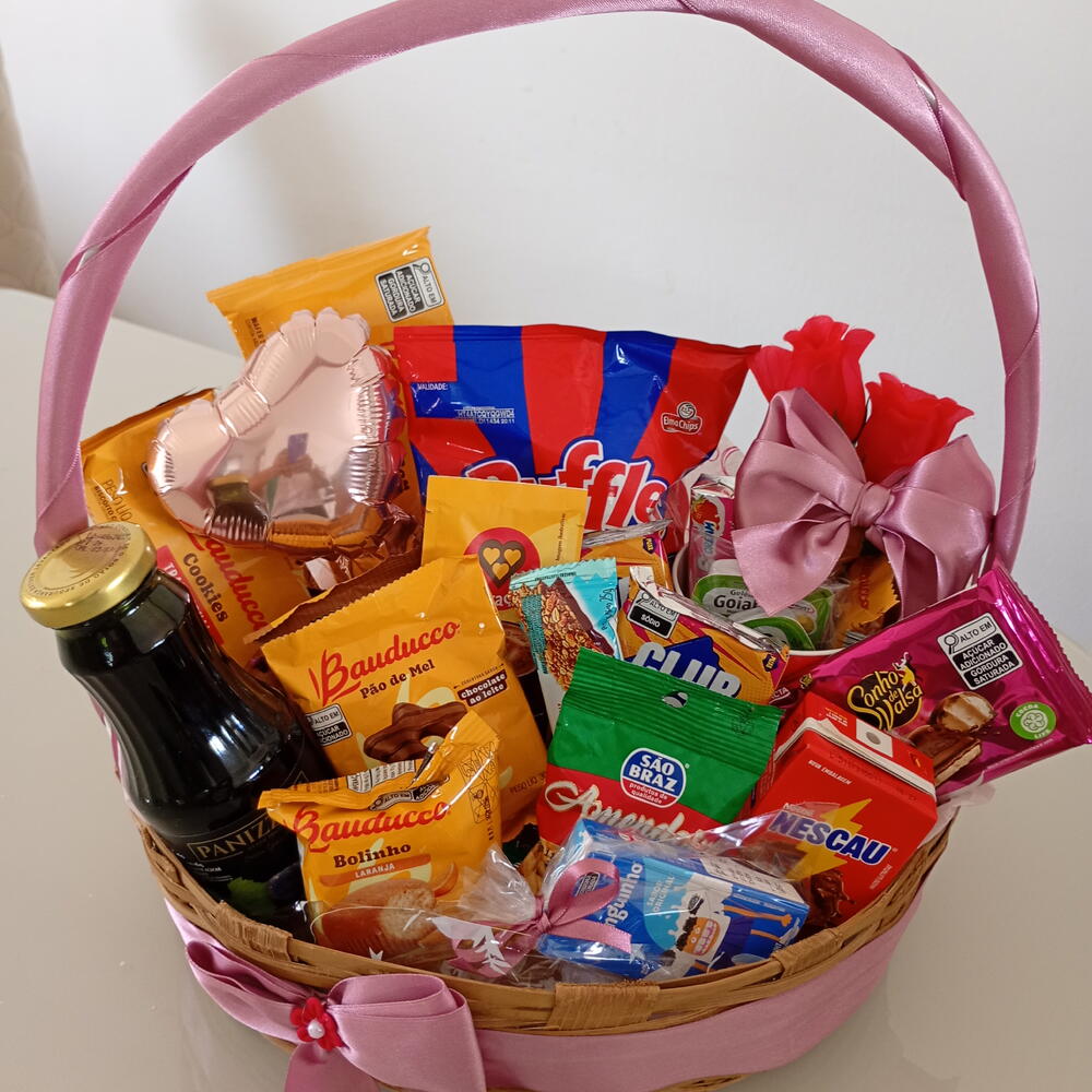 caneca - 1 pcs bolinho bauducco - 1 pcs barrinha de cereal - 1 pcs capuccino - 2 pcs bombons - 2 pcs cookies bauducco - 1 pcs suco de uva integral - 1 pcs pão de mel bauducco - 1 pcs torradas bauducco - 2 pcs clube social - 1 pcs nescau - 1 pcs botões de rosa - 2 pcs poleguinhos - 2 pcs grelhaditos - 1 pcs ruffles 40g - 1 pcs balão decorativo - 2 pcs geleia (sachê) - 2 pcs barra de chocolate 90 gr - 1 pcs