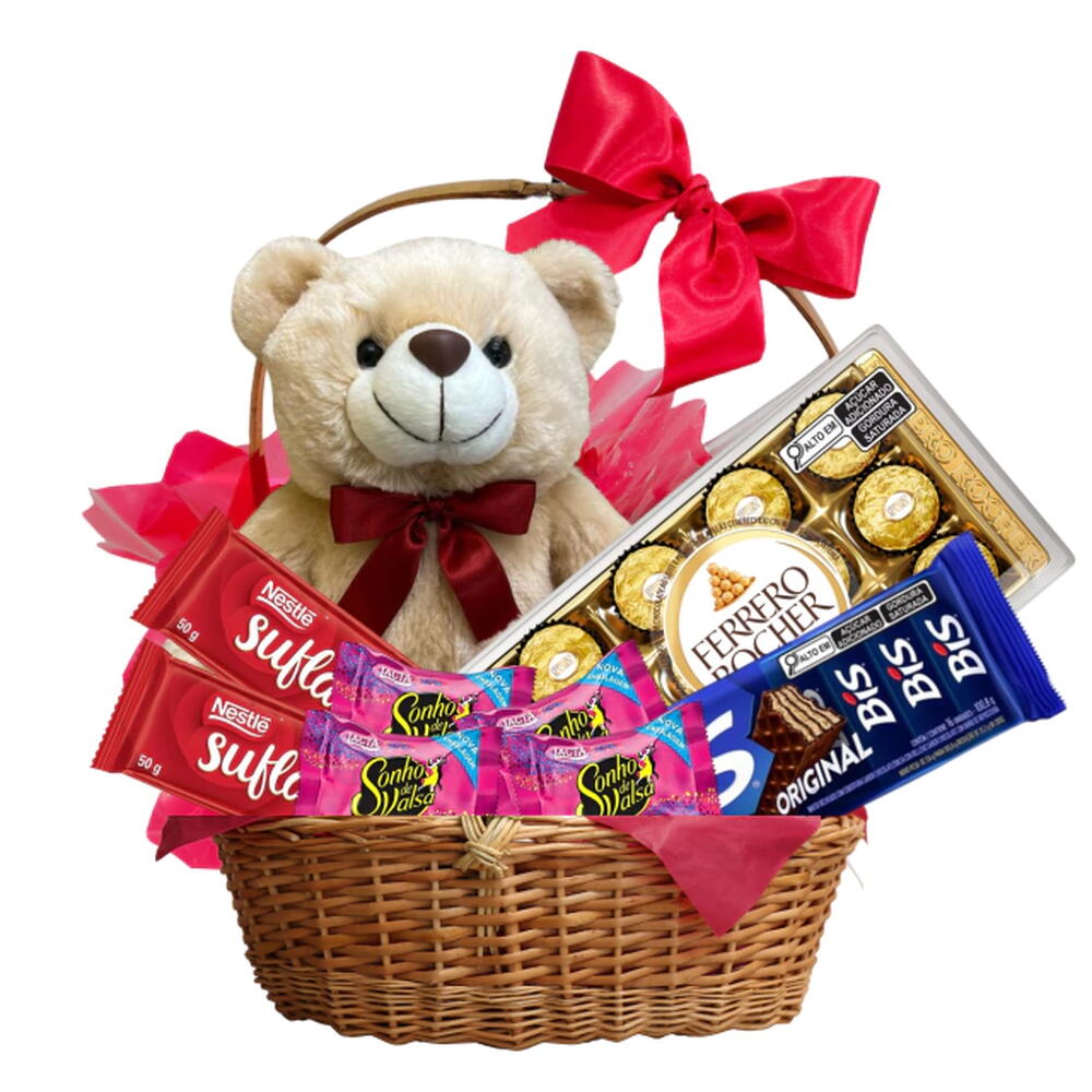 bis - 1 pcs ferrero rocher - 1 pcs sonho de valsa - 1 pcs suflair - 1 pcs cesta vime - 1 pcs urso de pelucia - 1 pcs laço em cetim - 1 pcs
