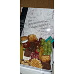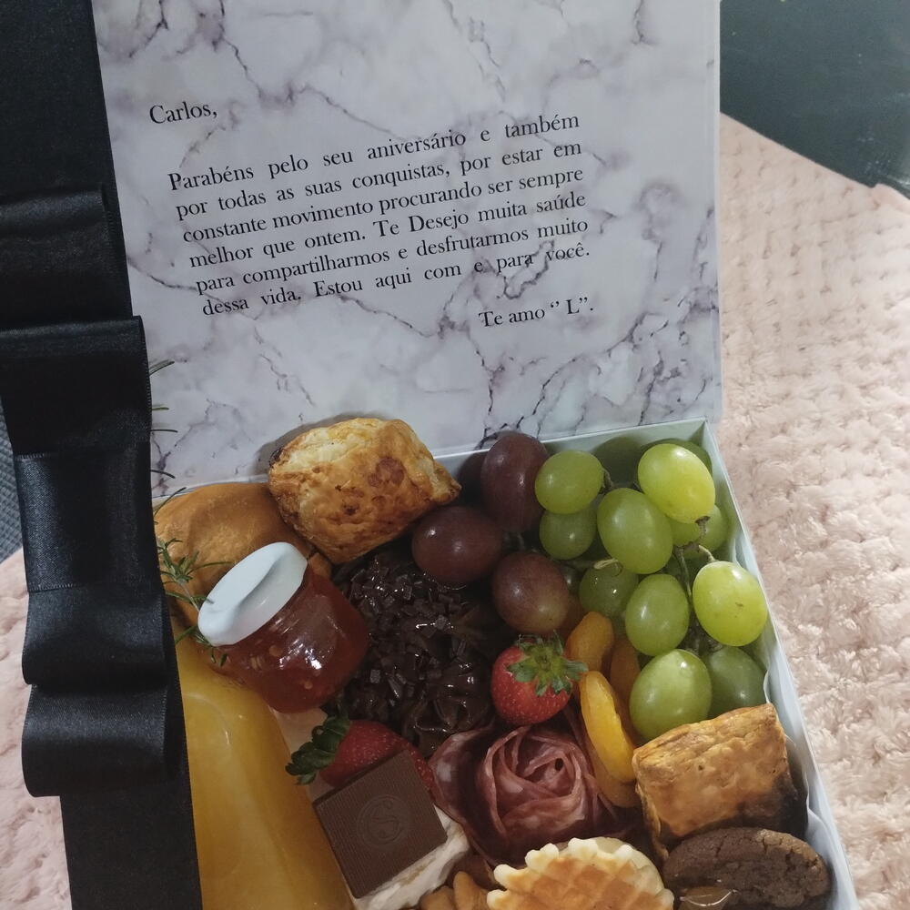 caixa cartonada - 1 pcs damasco - 100 g morangos frescos. - 2 pcs uva disponível - 50 g bolos caseiros - 1 pcs salame e queijos fatiados - 150 g mix de oleoginosas - 70 g