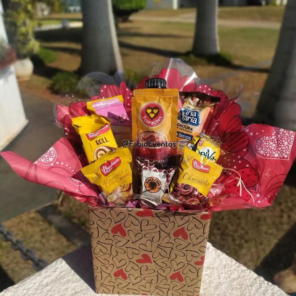 belvita - 1 pcs laço decorativo - 1 pcs bolacha bauducco - 2 pcs ana maria - 1 pcs wafer bauducco - 1 pcs roll (rocambole da bauducco) - 1 pcs suco dell vale 200ml - 1 pcs caixa papel rígido - 1 pcs bananinha - 1 pcs sache de cappuccino 20g - 1 pcs