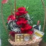 Este é um presente completo e perfeito para comemorar ocasiões especiais. Consiste em uma unidade de chocolate Ferrero Rocher para satisfazer os amantes de chocolates, um vinho importado requintado para celebrar o momento, amendoins para um saboroso aperitivo e um arranjo de rosas com folhagens para demonstrar seu carinho. Também inclui uma palha decorativa para adicionar um toque rústico elegante ao presente. Tudo isso é cuidadosamente organizado em uma cesta de palha e selado com um laço para um toque final. A embalagem atraente garante que o presente seja uma delícia até mesmo antes de ser aberto.