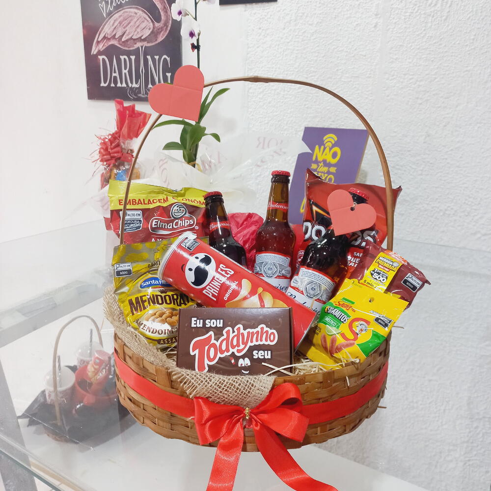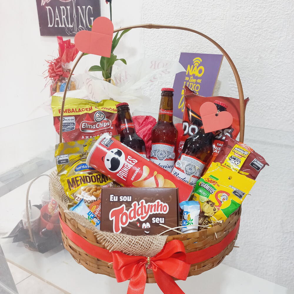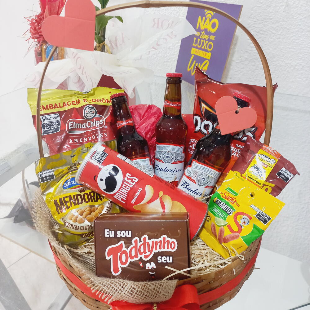 embalagem - 1 pcs cervejas - 1 pcs chocolates - 5 pcs cesta - 1 pcs batata pringles - 1 pcs doritos - 1 pcs amendoim - 1 pcs cesta budwaiar - 2 pcs ovitossalamitos - 1 pcs